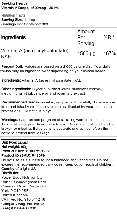 Vitamin A-tipat Seeking Health -tuotemerkiltä ovat kasviperäisiä, nestemäisiä ravintolisiä, jotka tarjoavat 1,500 mcg RAE A-vitamiinia tipassa. Tämä olennainen ravintoaine on välttämätön terveen immuniteetin, näön sekä normaalin kasvun ja kehityksen ylläpitämiseksi. Se tukee myös ihon ja limakalvojen terveyttä. Tuotteemme on ihanteellinen niille, jotka haluavat optimoida A-vitamiinin saantiaan tai tarvitsevat lisäravinteita, erityisesti jos heilllä on vaikeuksia niellään pillereitä tai kapseleita.