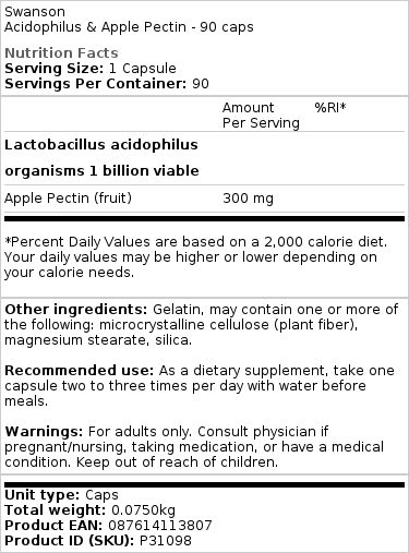 Acidophilus ja omenapektiini ovat luonnollisia ravintolisiä, jotka yhdessä edistävät terveen suoliston hyvinvointia. Acidophilus tunnetaan terveen suolistomikroflooran tukemisesta, kun taas omenapektiini, liukeneva kuitu, auttaa ylläpitämään säännöllisyyttä ja tukemaan ruoansulatusjärjestelmää. Swansonin Acidophilus & Omenapektiini-kapselit yhdistävät nämä kaksi ainesosaa optimaalisen tehokkuuden varmistamiseksi, tarjoavat elinkelpoisia bakteereja suolistoon ja sisältävät 1 miljardi elinkykyistä organismia sekä 300 mg omenapektiiniä annosta kohti.