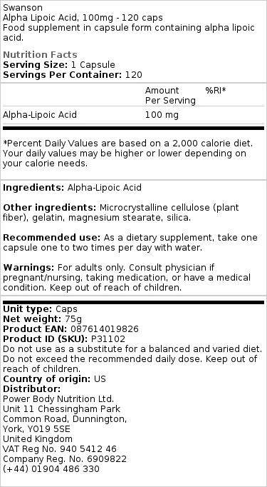 Tuotteen nimi: Swanson Alpha Lipoic Acid, 100mg - 120 kapselia
