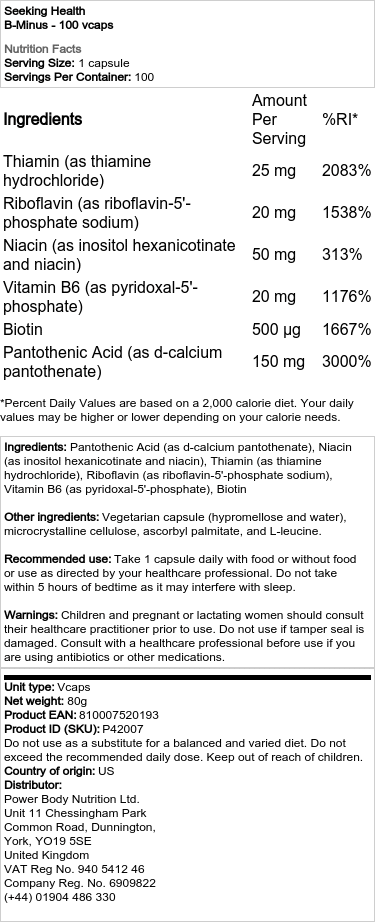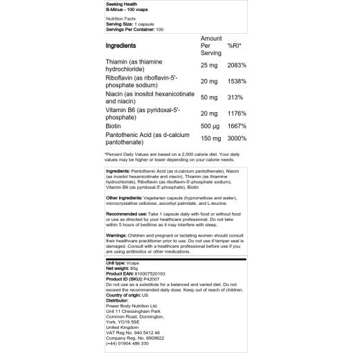 Tiamiini (tiamiinimononitraatti), riboflaviini (riboflaviini-5′-fosfaatti), niasiini (nikotiiniamidi), B6-vitamiini (pyridoksiinihydrokloridi), pantoteenihappo (kalsiumpantotenaatti), biotiini, kasviselluloosakapseli, mikrokiteinen selluloosa, magnesiumstearaatti ja piidioksidi.