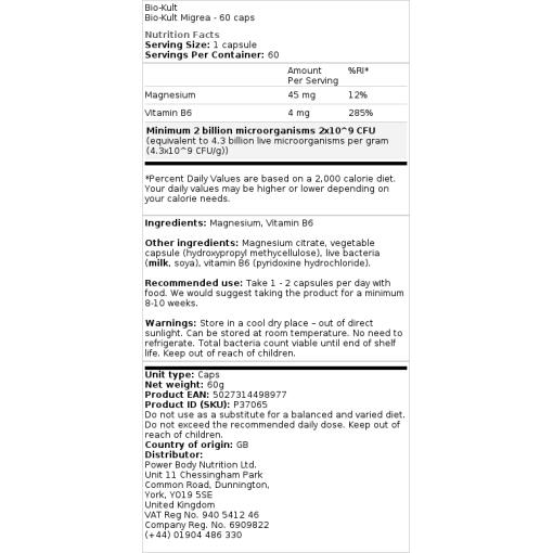 Anna itsellesi hyvinvointia Bio-Kult Migrealla, uusi osa Bio-Kult-sarjaa. Tämä ravintolisä koostuu elävistä bakteereista ja on rikastettu magnesiumilla ja B6-vitamiinilla, jotka molemmat tukevat hermoston normaalia toimintaa sekä auttavat vähentämään väsymystä ja uupumusta. B6-vitamiini tukee myös immuunijärjestelmän normaalia toimintaa ja edistää normaalia hormonaalista aktiivisuutta, mikä yhdessä auttaa ylläpitämään keskushermoston normaalia toimintaa.