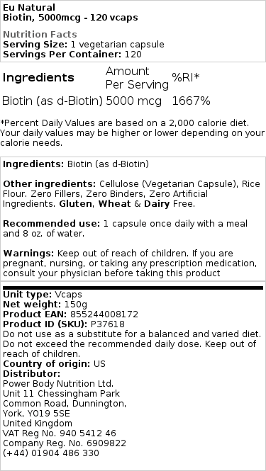 BIOTIINI 5000 mcg Eu Naturalilta on luonnollinen ratkaisu pidemmille hiuksille, vahvemmille kynsille ja hehkuvammalle iholle. Formulamme sisältää korkealaatuista puhdasta biotiinia tukemaan kaunista ulkonäköäsi.