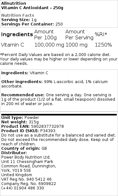 Tässä on kaikki, se todellakin tekee ja joskus tunnen itseni hemmoteltuna ottaa allnutrition tuotteita ha. Tämä on uskomattoman edullinen, saat 250 annosta pienempään ammeeseen (ne ovat puolet teelusikallista annosta kohden, joten se kestää iät), mutta samalla saat valtavan 1000 mg:n, joka on kaksinkertainen kilpailijoiden annokseen verrattuna. Erinomainen arvo, suuri annoskoko, bulkkituote ja iso annos. Olin iloinen, kun Larry sai tämän, ja ilmeisesti c-vitamiini on niin hyödyllinen antioksidanttina ja vastustuskyvyn vahvistajana!
