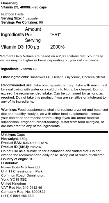 Tämä ravintolisä on valmistettu korkealaatuisista ja puhtaista raaka-aineista. Jokainen kapseli sisältää 100 mcg D3-vitamiinia (kolekalsiferoli), se muoto D-vitamiinia joka tukee tehokkaasti immuunijärjestelmän normaalia toimintaa ja edistää normaalia lihastoimintaa sekä ylläpitää normaaleja luita ja hampaita. Lisäksi se osallistuu solujen jakautumisprosessiin.