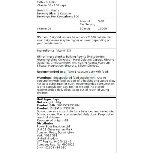 D3-vitamiini on olennainen terveyden ja hyvinvoinnin edistämiseksi. Reflex Nutrition tarjoaa korkealaatuisen D3-vitamiinilisän, joka on valmistettu tiukkojen farmaseuttisten standardien mukaisesti varmistaen maksimaalisen puhtauden ja tehokkuuden.