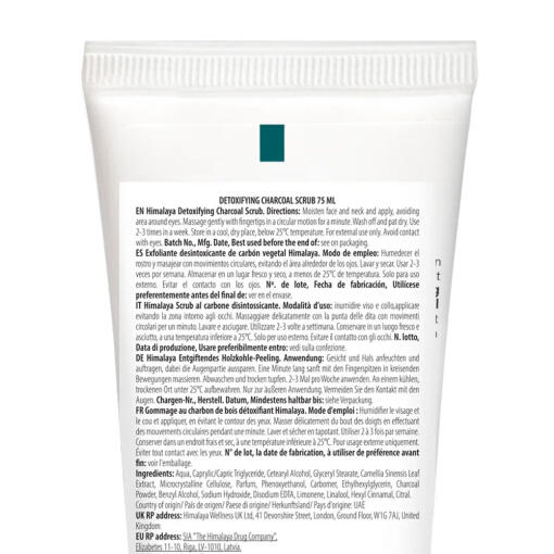 Himalaya Detoxifying Scrub aktiivihiilellä ja vihreällä teellä on hellävarainen kuoriva kuorinta, joka on suunniteltu puhdistamaan ja virkistämään ihoa. Tämä 75 ml:n tuubi sisältää luonnollisia ainesosia, jotka auttavat poistamaan kuolleet ihosolut ja jättävät ihon pehmeäksi ja säteileväksi.