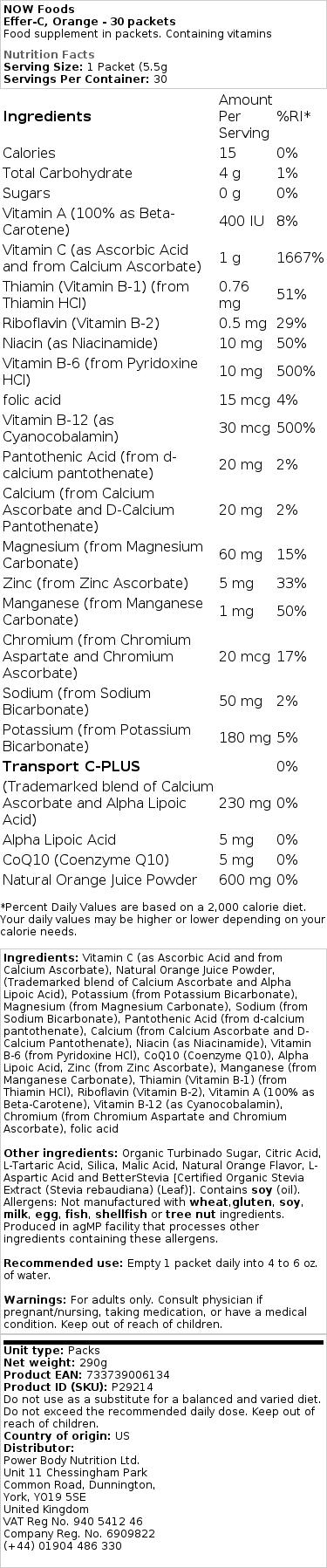 Tukeaksesi vahvaa immuunijärjestelmää vuodenaikojen vaihteluiden ja päivittäisten haasteiden keskellä, kokeile NOW Effer-C:tä. Tämä poreileva C-vitamiinilisä on suunniteltu kätevyyttä ja tehokkuutta ajatellen, erityisesti sen ainutlaatuisen koostumuksen ansiosta, joka sisältää olennaisia vitamiineja ja mineraaleja optimaalisen hyvinvoinnin takaamiseksi. Se auttaa nopeasti palauttamaan tarvittavat elektrolyytit pitämään sinut aktiivisena koko päivän. Jokaisessa pakkauksessa on 1000 mg C-vitamiinia, mukaan lukien Transport C-PLUS – puskuroitu muoto yhdistettynä alfalipoiinihappoon – varmistaen nopean imeytymisen.