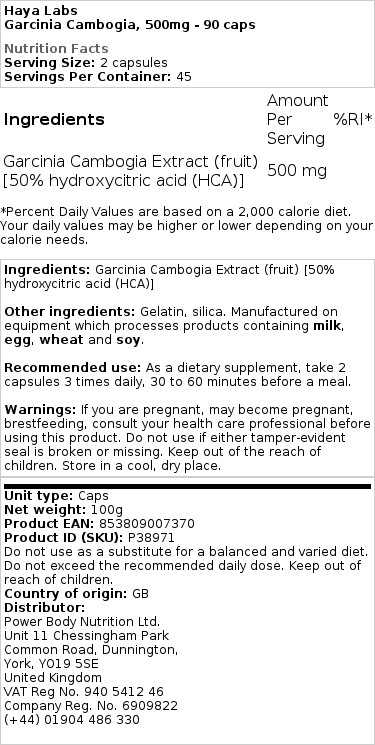 Haya Labs – Garcinia Cambogia, 500 mg – 90 kapselia