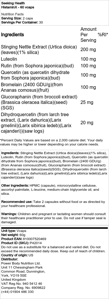 Seeking Healthin HistaminX on huolella koottu kaava, joka auttaa edistämään kehon kykyä käsitellä kausittaisia haasteita. Se sisältää sekoituksen yrttejä ja kasvipohjaisia yhdisteitä, jotka yhdessä tukevat terveellistä tulehdusvastetta ja immuunijärjestelmää.