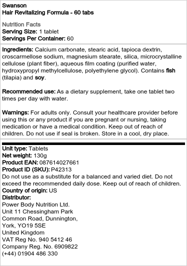 Hemmota hiuksiasi Swanson Ultra Advanced Hair Revitalizing Formula -ravintolisällä! Tämä ravintolisä on suunniteltu ravitsemaan hiussoluja juuresta latvaan. Edistynyt kaavamme sisältää synergisen sekoituksen huolella valittuja ravinteita, mukaan lukien B-vitamiinit, punapunakloveri-uute ja viinirypäleen siemen-uute. Nämä ainesosat on koottu optimaalisesti tasapainotettuihin määriin tukemaan ei vain hiusten elinvoimaisuutta vaan myös edistämään positiivisesti ihon ja kynsien hyvinvointia.