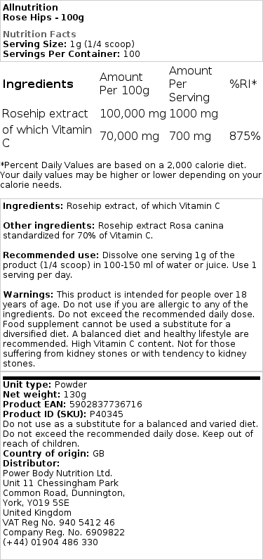 Löydä Allnutrition – Ruusunmarja, luonnollinen ravintolisä, joka sisältää 100g puhdasta ruusunmarja-uutetta. Tämä tuote on ihanteellinen hyvinvointisi edistämiseen ja terveellisen elämäntavan tukemiseen.