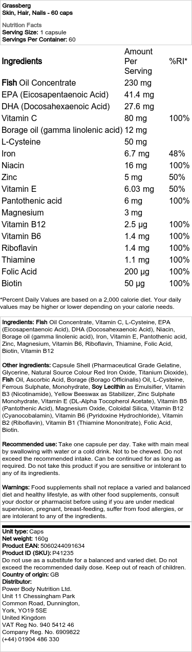 Löydä Grassberg Iho, Hiukset ja Kynnet – luonnollinen ravintolisä suunniteltu edistämään ihon, hiusten ja kynsien terveyttä. Tämä lisäravinne on runsaasti välttämättömiä vitamiineja ja mineraaleja, jotka tukevat nuorekasta hehkua ja tarjoavat antioksidanttisuojaa.