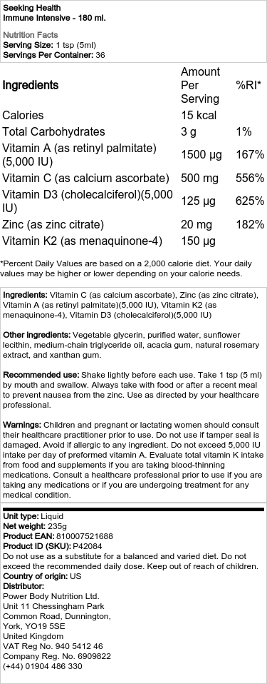 Immun Intensiivinen on edistynyt ravintolisä, joka tarjoaa voimakkaan sekoituksen välttämättömiä ravintoaineita, suunniteltu tukemaan immuunipuolustusta. Tämä nestemäinen lisäravinne on kehitetty optimaalista imeytymistä ja biologista hyödynnettävyyttä varten.