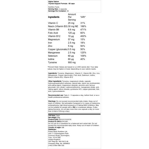 Kilpirauhasen tukikaava tarjoaa tarvittavia ravintoaineita kilpirauhashormonien tuotantoon. Tämä sekoitus sisältää tyrosiinin, jodin ja seleenin yhdessä yhdeksän muun vitamiinin ja mineraalin kanssa kompleksissa suunniteltuna kasvissyöjille ja vegaaneille.