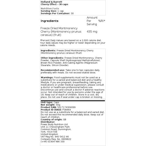 Holland & Barrett Cherry Effect -kapseleissa on 435 mg pakastekuivattua Montmorency-kirsikkaa per kapseli. Tämä pakastekuivausprosessi auttaa säilyttämään kirsikoiden luonnolliset ja tehokkaat ominaisuudet.