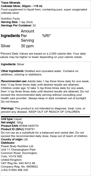 Löydä kolloidisen hopean edut premium-lisäravinteellamme, joka sisältää 30 ppm (osaa miljoonasta) erittäin puhdasta ja happeutettua kolloidista hopeaa. Tämä tuote on huolellisesti valmistettu edistyneen prosessin avulla varmistaen optimaalisen laadun ja puhtauden.