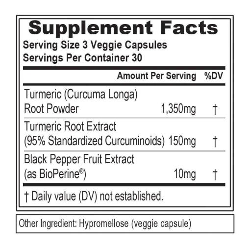 Kurkumanjuuri (Curcuma longa): Sisältää luonnollisesti esiintyviä kurkuminoideja (95%) – Määrä: 1500 mg