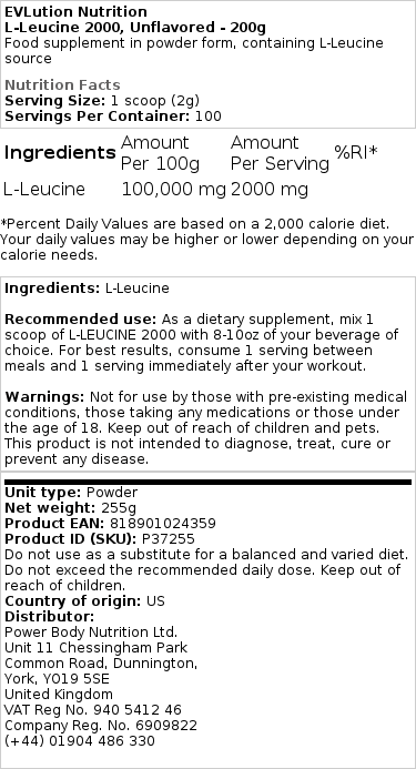 EVLution Nutrition – L-Leusiini 2000 tarjoaa korkealaatuisen lisäravinteen, joka tukee terveellisempään elämäntapaan pyrkimystänne. Muistakaa aina monipuolisen ja tasapainoisen ruokavalion sekä terveellisten elämätapojen merkitys.