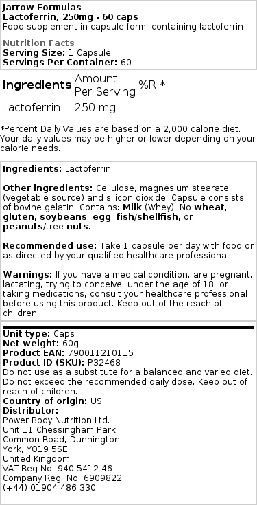 - Sisältää 250 mg laktoferrinia kapselia kohti.