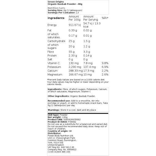 Löydä voima afrikkalaisesta “elämän puusta” luomu baobabjauheellamme. Tämä luonnollinen ravintolisä valmistetaan baobab-hedelmästä, joka tunnetaan ravitsevasta profiilistaan ja raikkaasta sitruunaisesta maustaan. Baobabimme tulee kestävistä lähteistä, joissa yli 1000 naista Etelä-Afrikassa osallistuu sadonkorjuuseen ja saa vakaan tulon, mikä tukee heidän yhteisöään.