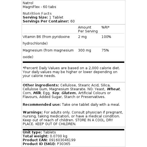 MagniFlex on luonnollinen ravintolisä, joka sisältää 300 mg magnesiumia tablettia kohti, mikä auttaa ylläpitämään päivittäistä magnesiumtasapainoa yhdellä tabletilla päivässä. Tämä tuote on suunniteltu tukemaan terveellistä elämäntapaa edistämällä yleistä hyvinvointia useilla avainalueilla:
