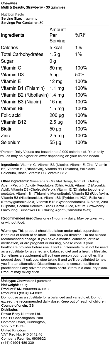 Tutustu Chewwies Monivitamiini & Kauneus Blendiin! Olemme luoneet täydellisen vitamiinisekoituksen tukemaan sekä sisäistä että ulkoista kauneuttasi arvokkaan palautteenne perusteella. Uudet vegaaniset Multi & Beauty -geelipalat sisältävät voimakkaan yhdistelmän ravintoaineita ja antioksidantteja, jotka edistävät terveempiä hiuksia, vahvempia kynsiä ja hehkuvaa ihoa. Jokainen geelipala on täynnä monivitamiinisekoitusta B-vitamiineja, C-vitamiinia, D3-vitamiinia, foolihappoa, sinkkiä, seleeniä ja biotiinia – ilman sokeria! Ota vain yksi geelipala päivittäin.