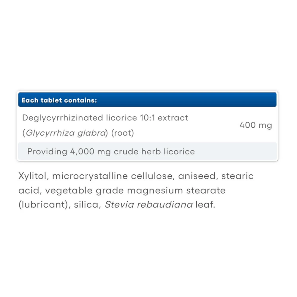 Tuotteen pääainesosa on deglykyrritsiinihappoa poistettu lakritsinjuuri (DGL). Lakritsinjuuri on perinteisesti käytetty tukemaan ruoansulatusjärjestelmän terveyttä ja hyvinvointia.