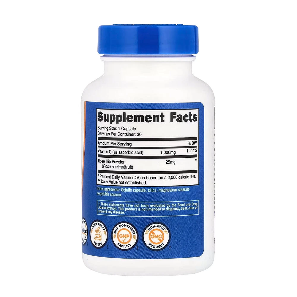 Nutricost Vitamin C with Rose Hips Capsules tarjoaa korkealaatuista C-vitamiinia yhdessä ruusunmarjauutteen kanssa kätevässä kapselimuodossa.