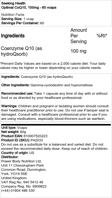 Optimal CoQ10 Seeking Healthilta on luonnollinen ravintolisä, joka auttaa ylläpitämään terveellistä elämäntapaa tukemalla energiantuotantoa solutasolla ja yleistä solujen eheyttä. Jokainen kapseli sisältää 100 mg CoQ10:a, joka edistää elimistön luonnollisen puolustuksen optimaalista toimintaa hapettumisvaurioita vastaan.