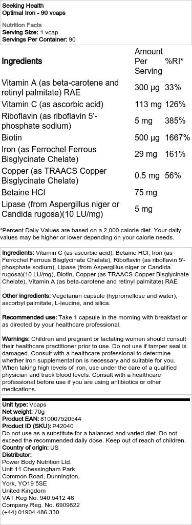 Optimaalinen Rauta sisältää Ferrochel Ferrous Bisglycinate Chelate -muodon, joka tunnetaan erinomaisesta imeytymisestään. Yhdessä olennaisten vitamiinien ja kivennäisaineiden kuten A-vitamiinin, C-vitamiinin, kuparin, biotiinin ja riboflaviinin kanssa tämä tuote varmistaa raudan optimaalisen hyödyntämisen. Nämä ravintoaineet ovat tärkeässä roolissa elimistön kyvyssä imeyttää ja kuljettaa rautaa tehokkaasti.