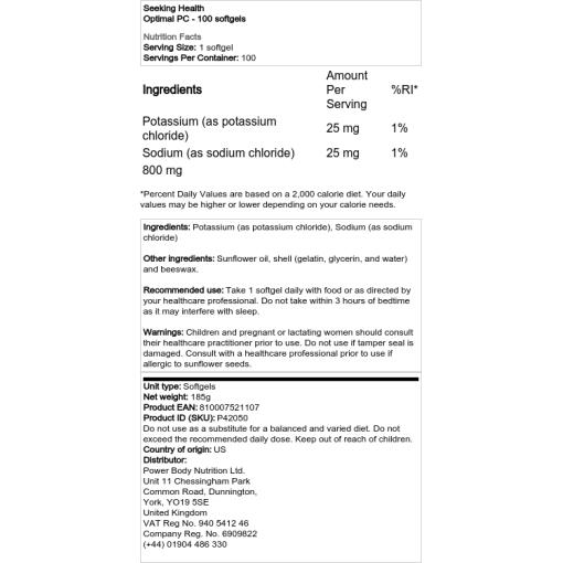 Optimal PC Softgels sisältää korkeasti puhdistettuja fosfolipidejä ei-GMO auringonkukkaöljystä, mukaan lukien noin 15% (w/w) fosfatidyylikoliinia, ilman soijaa.