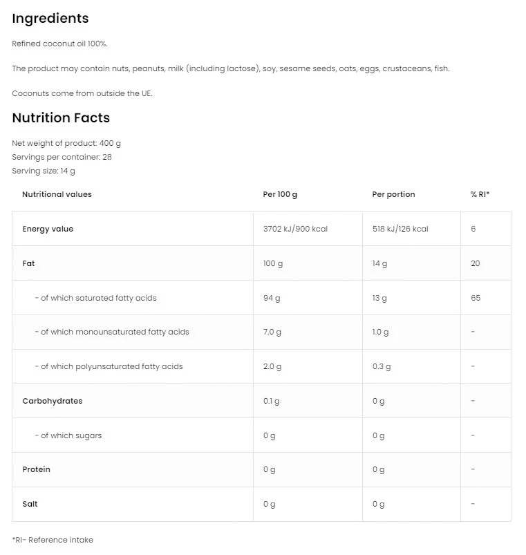 Sisältö ja pakkaus: Jokainen pakkaus sisältää 400 g puhdasta kookosöljyä.