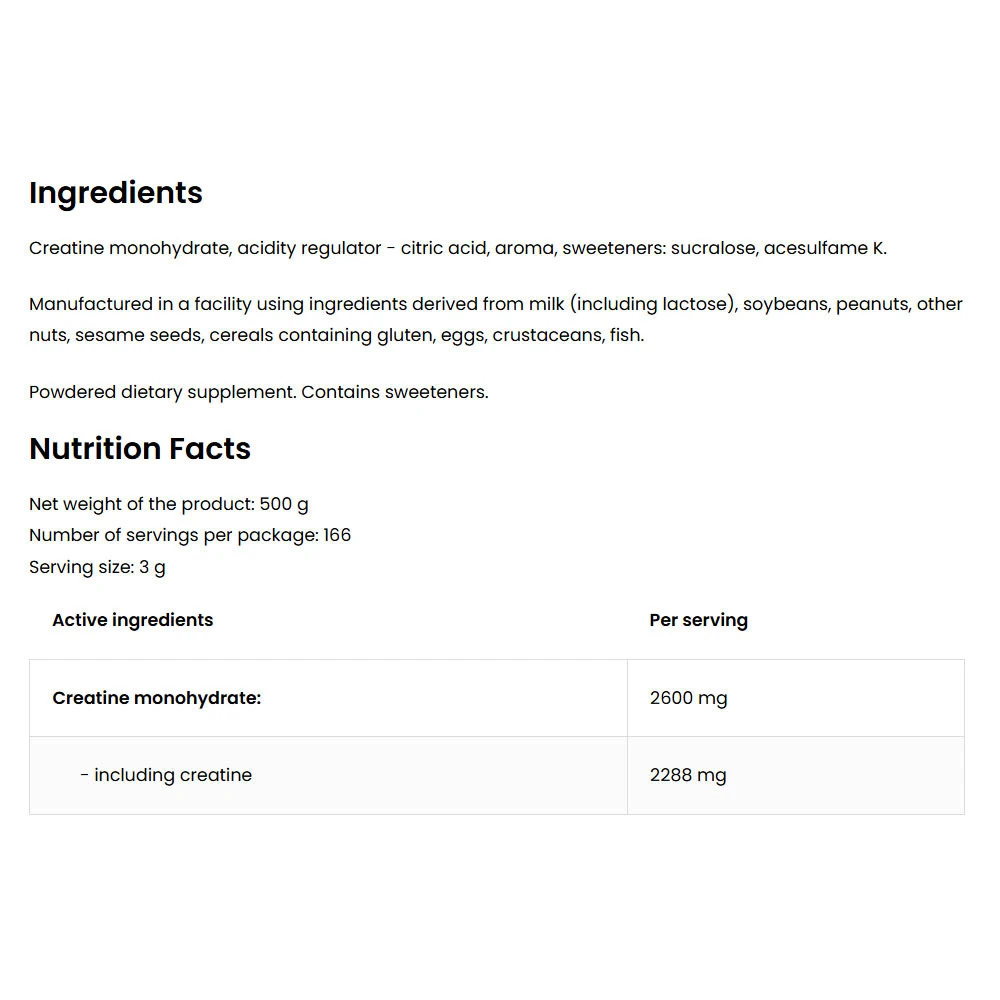 Tuote sisältää puhdasta kreatiinimonohydraattia. Kreatiini on yleisesti käytetty ainesosa, jonka alkuperä on luonnollinen.