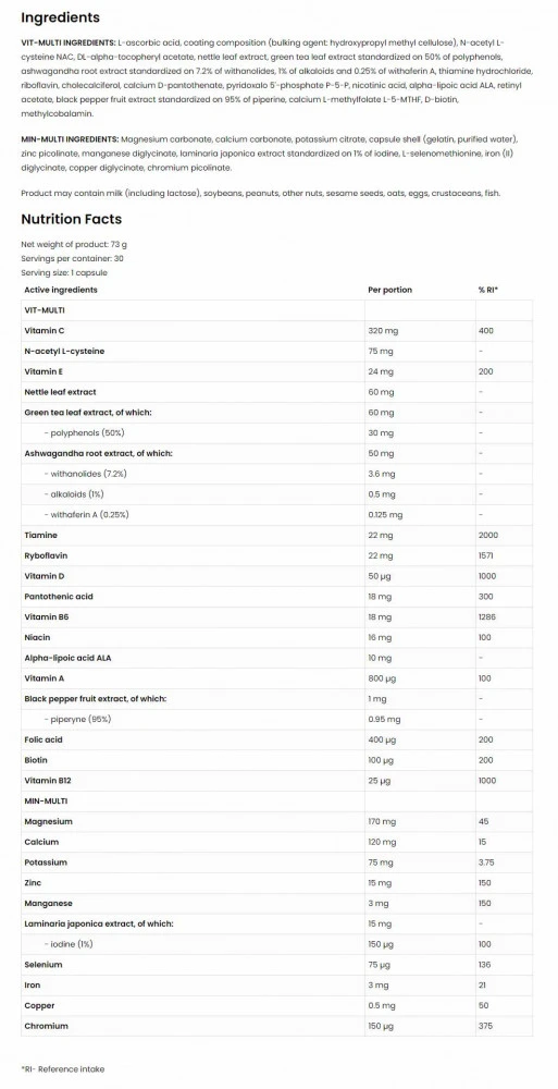 Tämä tuote on valmistettu Puolassa ja se sisältää laajan valikoiman vitamiineja ja kivennäisaineita. Kapselit on suunniteltu tukemaan aktiivista elämäntapaa korkealaatuisilla, luonnollisilla ainesosilla.