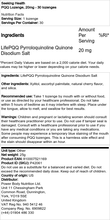 PQQ Pastillit Seeking Healthiltä sisältävät 20 mg LifePQQta per pastilli, mikä tekee sen helpoksi ottaa. PQQ on pieni kinonimolekyyli, joka tukee solujen energiantuotantoa ja elimistön puolustusta hapettumisvaurioita vastaan. Sen kyvyn kierrättää redoxreaktioissa ja palata aktiiviseen muotoonsa ansiosta PQQ katsotaan olevan erityisen stabiili verrattuna CoQ10:een ja muihin antioksidantteihin. Sitä löytyy luonnollisesti monista ympärillämme olevista elementeistä, mukaan lukien tähtipöly sekä entsyymikofaktorina tietyissä bakteereissa ja elintärkeänä komponenttina useimmissa kasveissa.