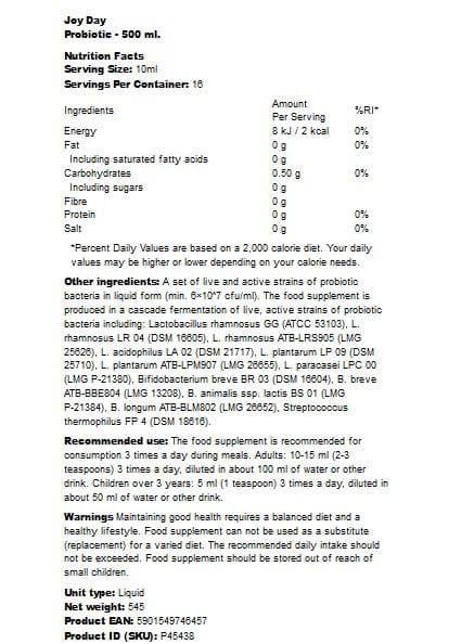 Probiootti – 500 ml. on nestemäinen ravintolisä, joka sisältää eläviä ja aktiivisia probioottisia bakteerikantoja. Tämä tuote on suunniteltu edistämään terveellistä suolistomikrobiomia ja tukemaan ruoansulatusjärjestelmän yleistä hyvinvointia.
