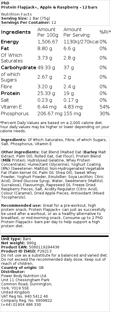 Tutustu herkulliseen makuun PhD Protein Flapjack+ omenalla ja vadelmalla. Nämä ravinteikkaat patukat on luotu tukemaan aktiivista elämäntapaa ja edistämään hyvinvointia. Ihanteellinen yhdistelmä proteiinia ja monimutkaisia hiilihydraatteja tekee näistä flapjacks-patukoista erinomaisen valinnan niille, jotka haluavat nauttia herkullisesta välipalasta samalla säilyttäen ravitsemuksellisen tasapainon.