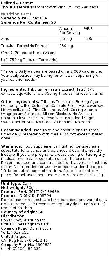 Löydä Holland & Barrett Tribulus Terrestris -kapseleiden edut, jotka on rikastettu sinkillä. Tämä luonnollinen ravintolisä on suunniteltu tukemaan yleistä hyvinvointiasi ja vaikuttamaan positiivisesti elämääsi. Jokainen kapseli sisältää 250 mg korkealaatuista Tribulus Terrestris -uutetta, joka on standardoitu varmistaakseen 40% saponiinipitoisuuden.