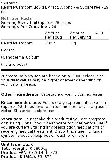 Swanson – Reishi sieni nestemäinen uute – 29 ml