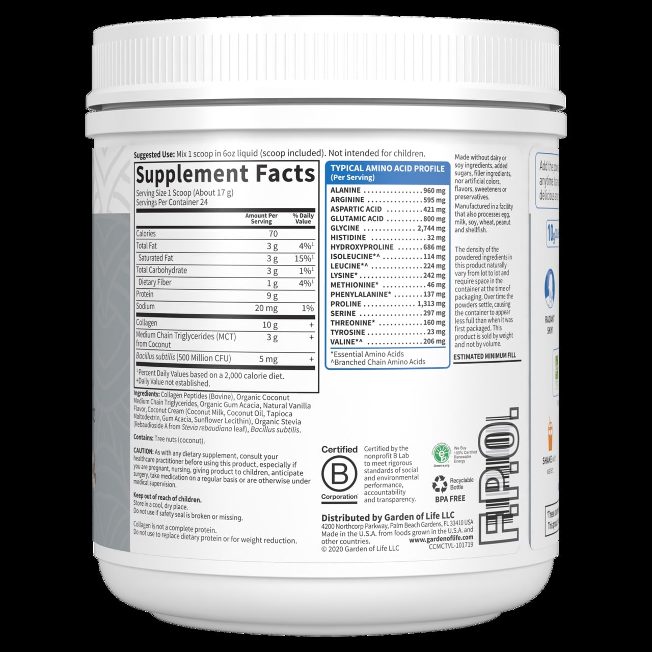 Tuotekuvaus: Ruoholla ruokittu kollageeni kookos MCT vanilja 14,39 oz (408 g) jauhe