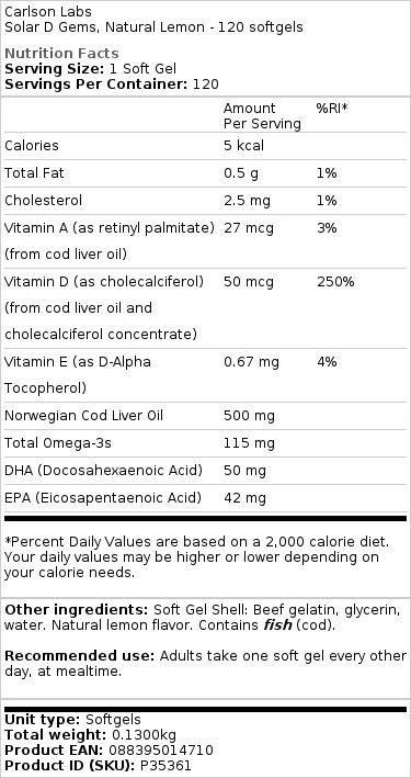 Carlson Labs – Solar D Perler, 2000 IE Naturlig Citron – 120 bløde kapsler