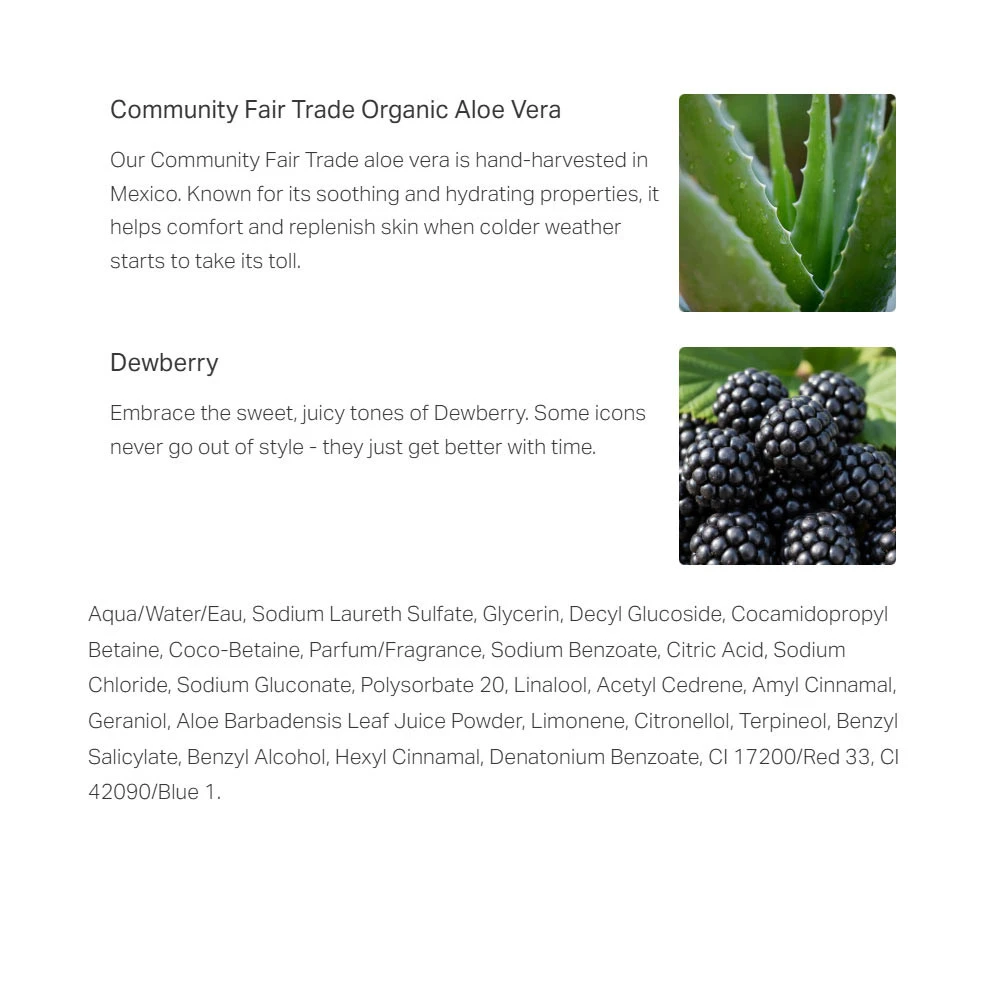 The Body Shop Dewberry Shower Gel sisältää valikoituja kasvipohjaisia ainesosia, kuten dewberry-uutetta. Dewberry on perinteisesti käytetty sen kosteuttavien ominaisuuksien vuoksi ja se tunnetaan myös miellyttävästä tuoksustaan. Tuote on suunniteltu puhdistamaan iho hellävaraisesti jättämättä sitä kuivaksi.