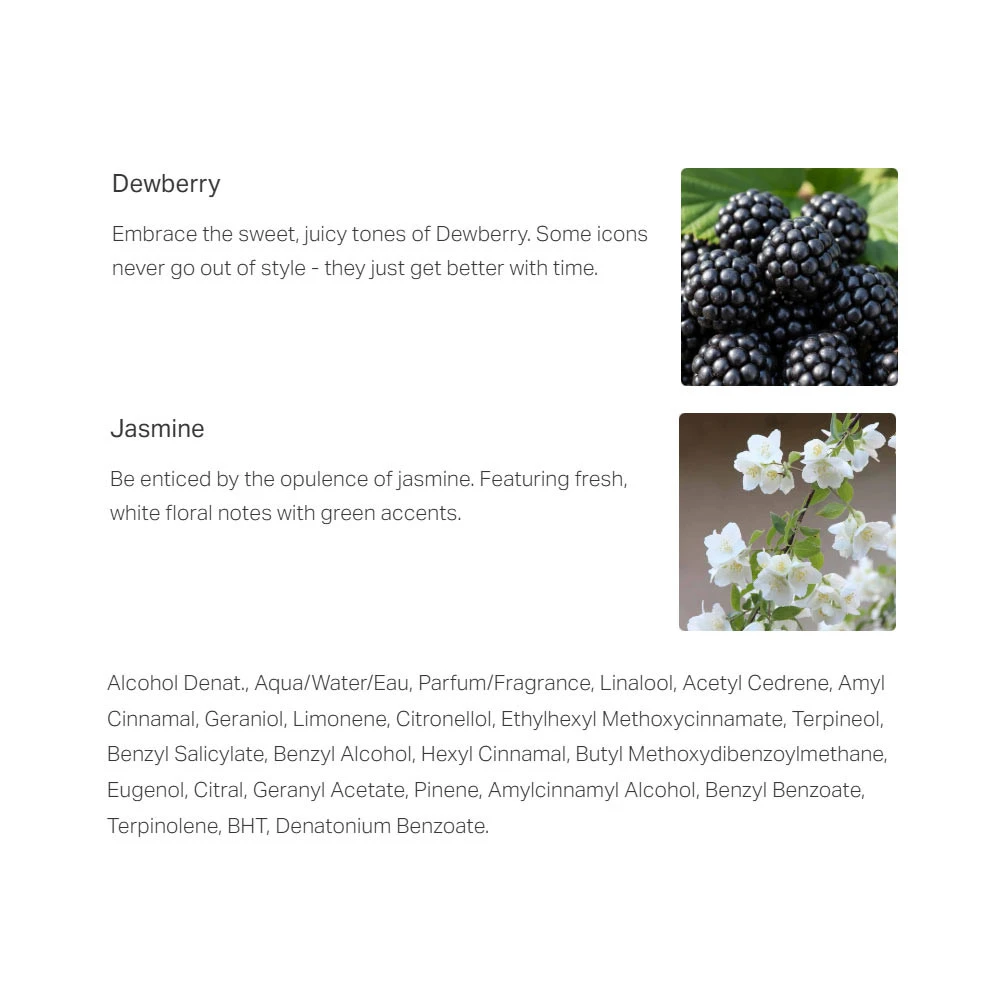 The Body Shop Dewberry Fragrance Mist sisältää huolellisesti valittuja ainesosia, kuten dewberry-uutetta. Dewberry eli suomeksi mesimarja on tunnettu sen hedelmäisen ja virkistävän aromin ansiosta. Tuote sisältää myös muita luonnollisia aromeja, jotka yhdessä luovat miellyttävän ja kestävän tuoksuelämyksen.