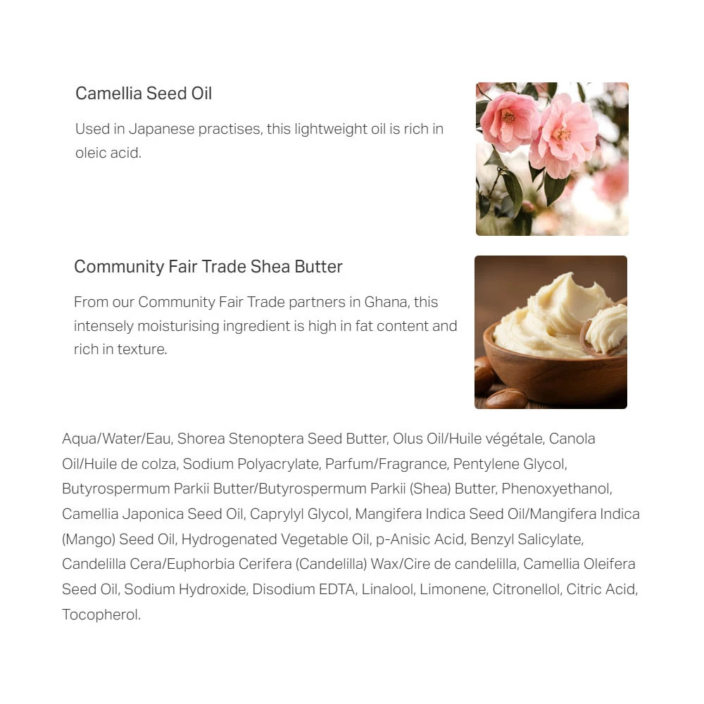 The Body Shop Japanese Camellia Body Cream on ylellinen vartalovoide, joka hemmottelee ihoa samettisen pehmeällä koostumuksellaan ja hienostuneella tuoksullaan. Tämä 350 ml pakkauksessa oleva voide sisältää japanilaista kamelian öljyä, joka on tunnettu kosteuttavista ominaisuuksistaan.