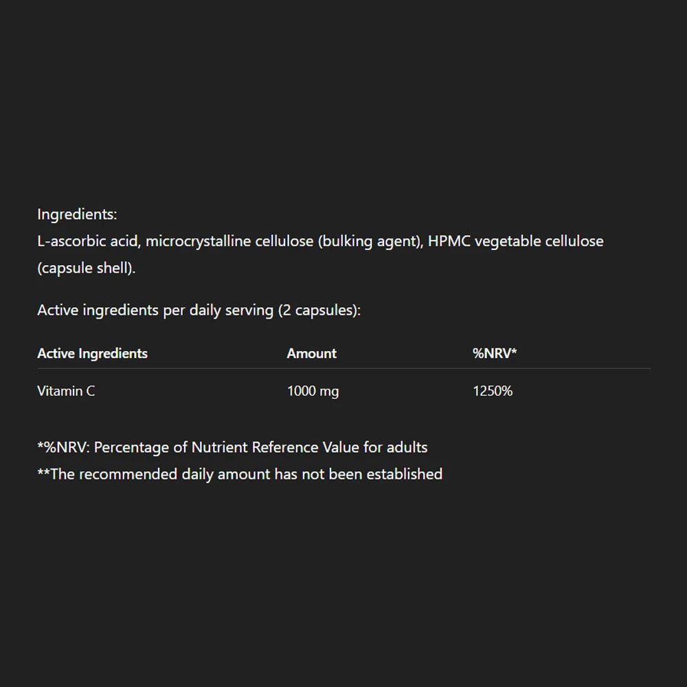 USA medical Vitamin C 1000 mg sisältää puhdasta askorbiinihappoa, joka on tehokas muoto C-vitamiinista. Tuote on valmistettu korkeita laatuvaatimuksia noudattaen, varmistaen sen puhtauden ja tehoaineiden optimaalisen säilymisen.
