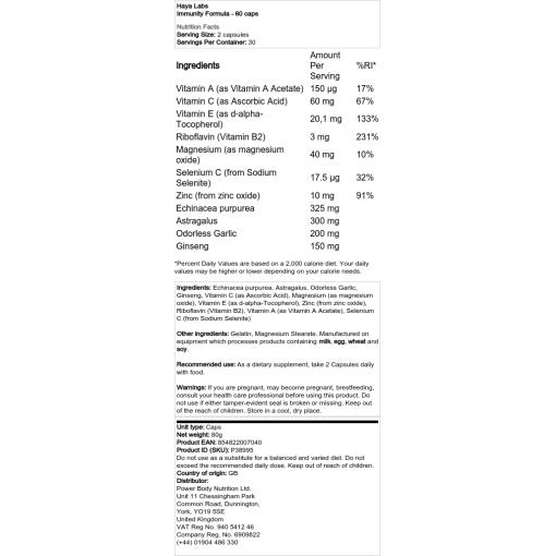 Tutustu HAYA Labs Immunity Formula 60 Caps. -valmisteeseen, huolellisesti koostettuun ravintolisään, joka sisältää olennaisia vitamiineja, kivennäisaineita ja yrttejä. Tämä tuote on suunniteltu tukemaan ja edistämään kehon luonnollista immuunijärjestelmää sekä edistämään yleistä hyvinvointia.
