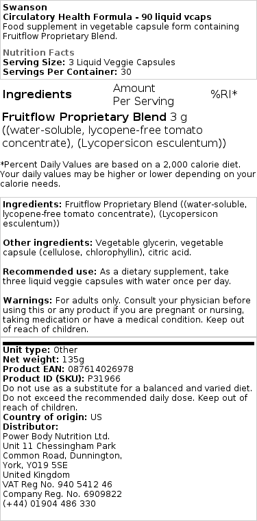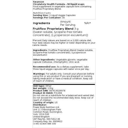 Koe Fruitflown hyödyt Swanson Circulatory Health Formulalla. Ota yksi kapseli päivittäin veden kanssa. Optimaalisten tulosten saavuttamiseksi suositellaan noudattamaan tuotteen etiketissä olevia ohjeita.