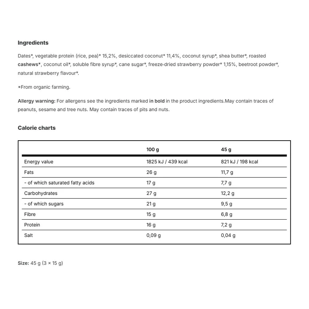 Vilgain Plant Protein Energy Balls sisältää korkealaatuista kasviproteiinia, luomumansikoita ja kookosta. Mansikka on perinteisesti käytetty sen antioksidanttisten ominaisuuksien vuoksi ja kookos tuo mukaan hyviä rasvoja sekä trooppisen vivahteen.