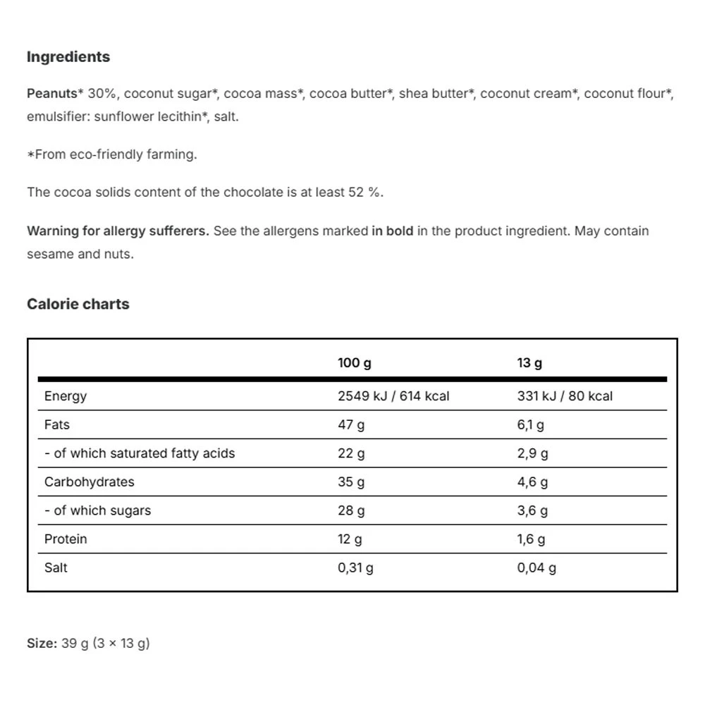 Tämän tuotteen maapähkinät voivat edistää normaalia energia-aineenvaihduntaa proteiinipitoisuutensa ansiosta, mikä on tärkeää erityisesti aktiivisille ihmisille ja urheilijoille. Lisäksi tumman suklaan antioksidantit voivat auttaa suojaamaan soluja hapettumisstressiltä.
