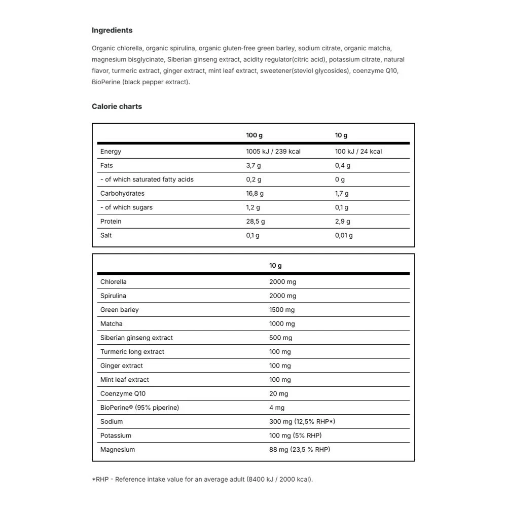 Vilgain Greens Mix sisältää useita kasvipohjaisia ainesosia, kuten spirulinaa ja chlorellaa, jotka ovat perinteisesti käytettyjä yleisen hyvinvoinnin edistämiseksi. Lisäksi tuote sisältää mm. vehnänorasta ja ohranorasta, jotka ovat tunnettuja luontaisista vitamiineistaan ja mineraaleistaan.